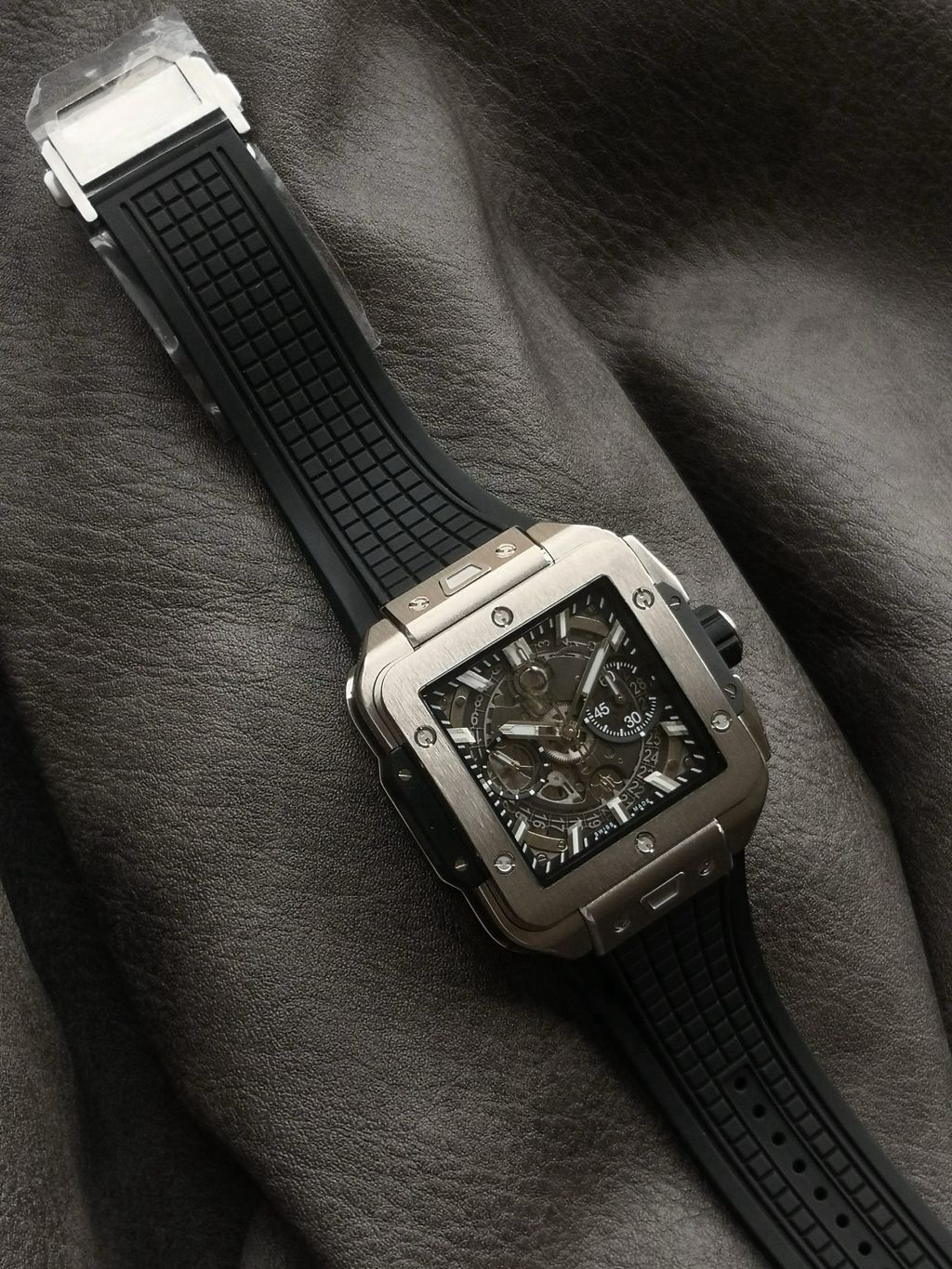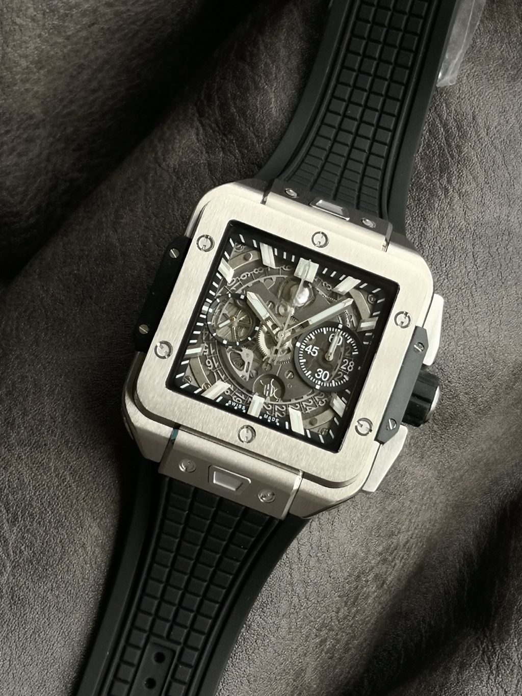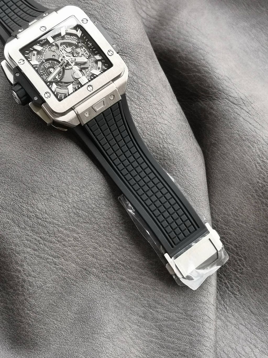 BBF Factory 42mm Top Replica Hublot Square Bang Unico Square Hollow Chronograph Dial Rubber Strap Racing Sports Style