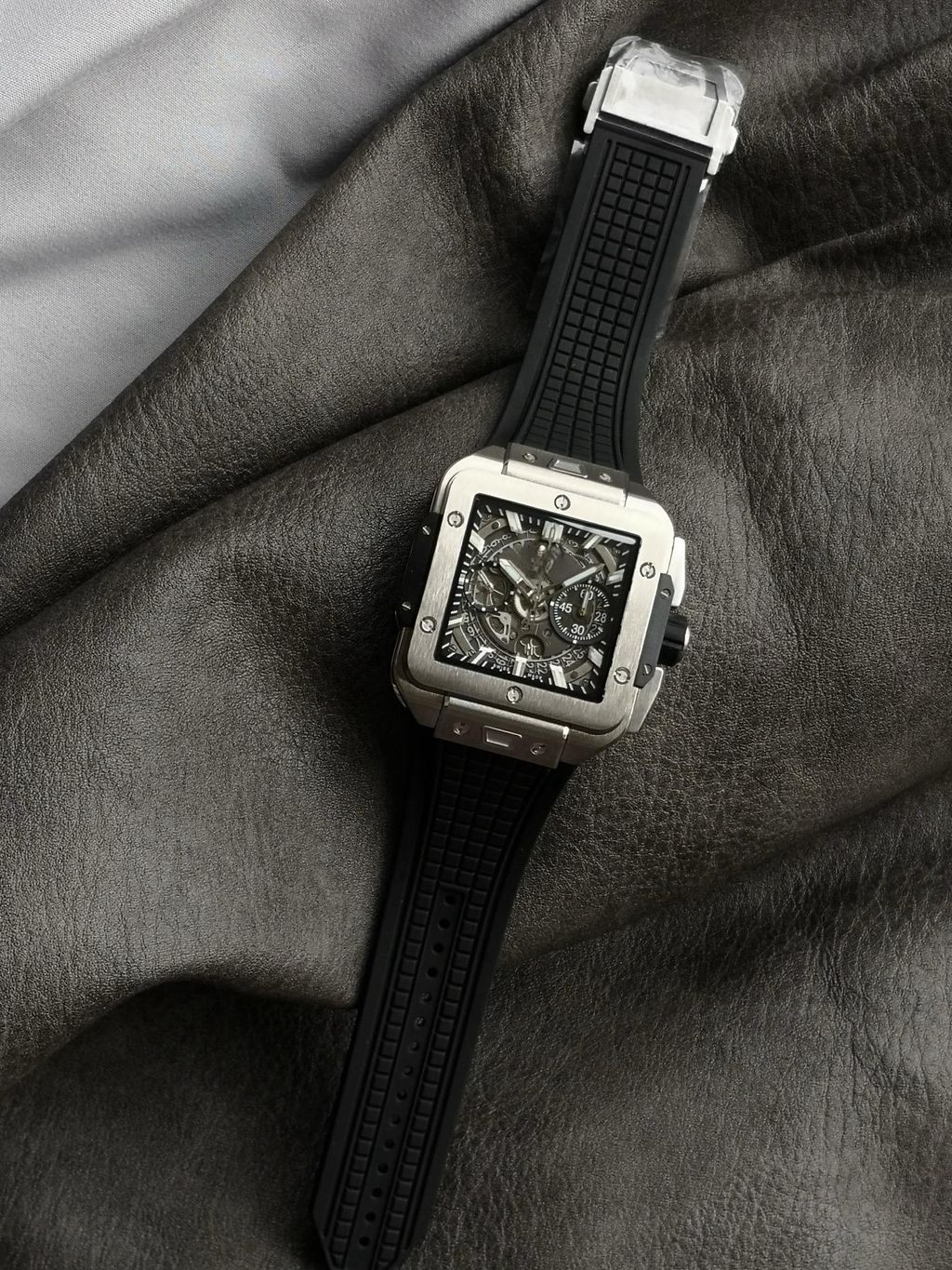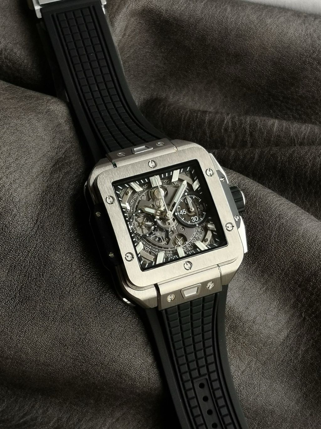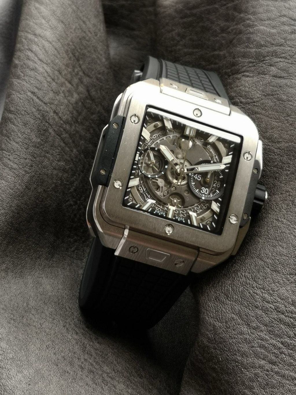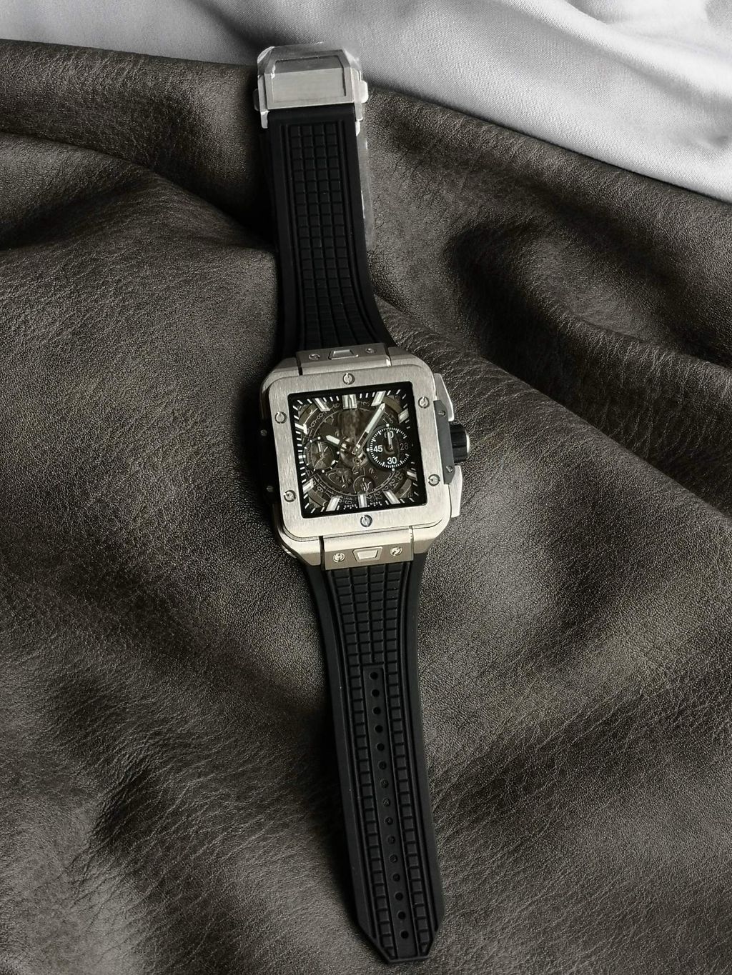 BBF Factory 42mm Top Replica Hublot Square Bang Unico Square Hollow Chronograph Dial Rubber Strap Racing Sports Style