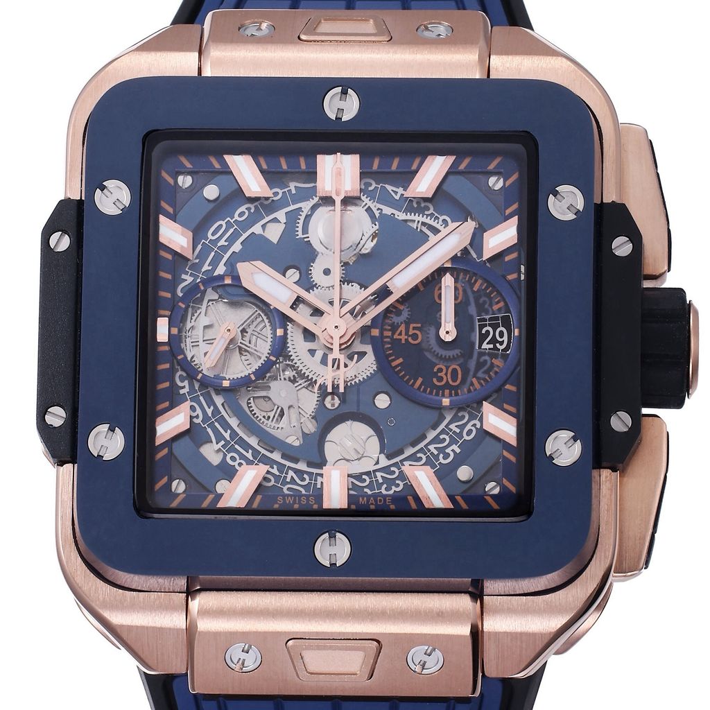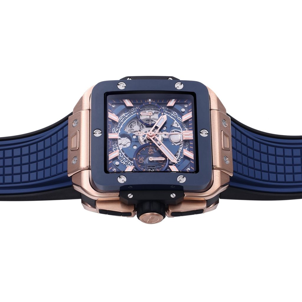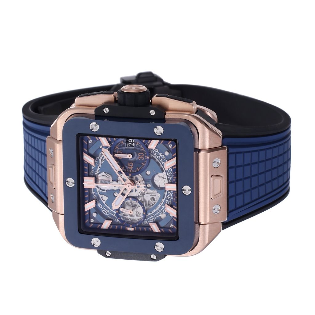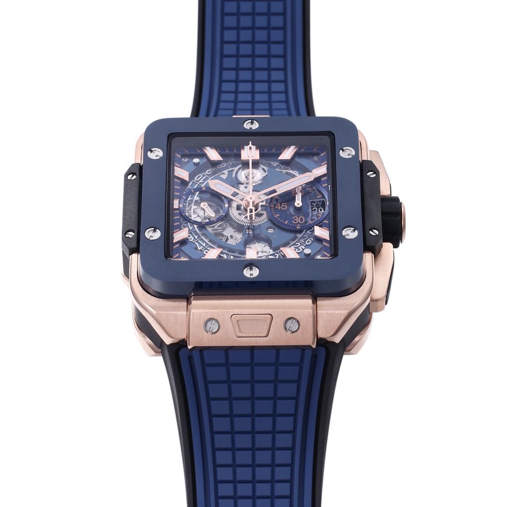 BBF Factory 42mm Top Replica Hublot Square Bang Unico Square Hollow Chronograph Dial Ceramic Bezel 18K Rose Gold Rubber Strap Racing Sports Style