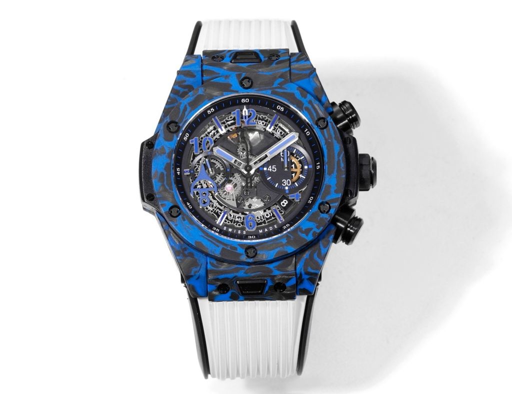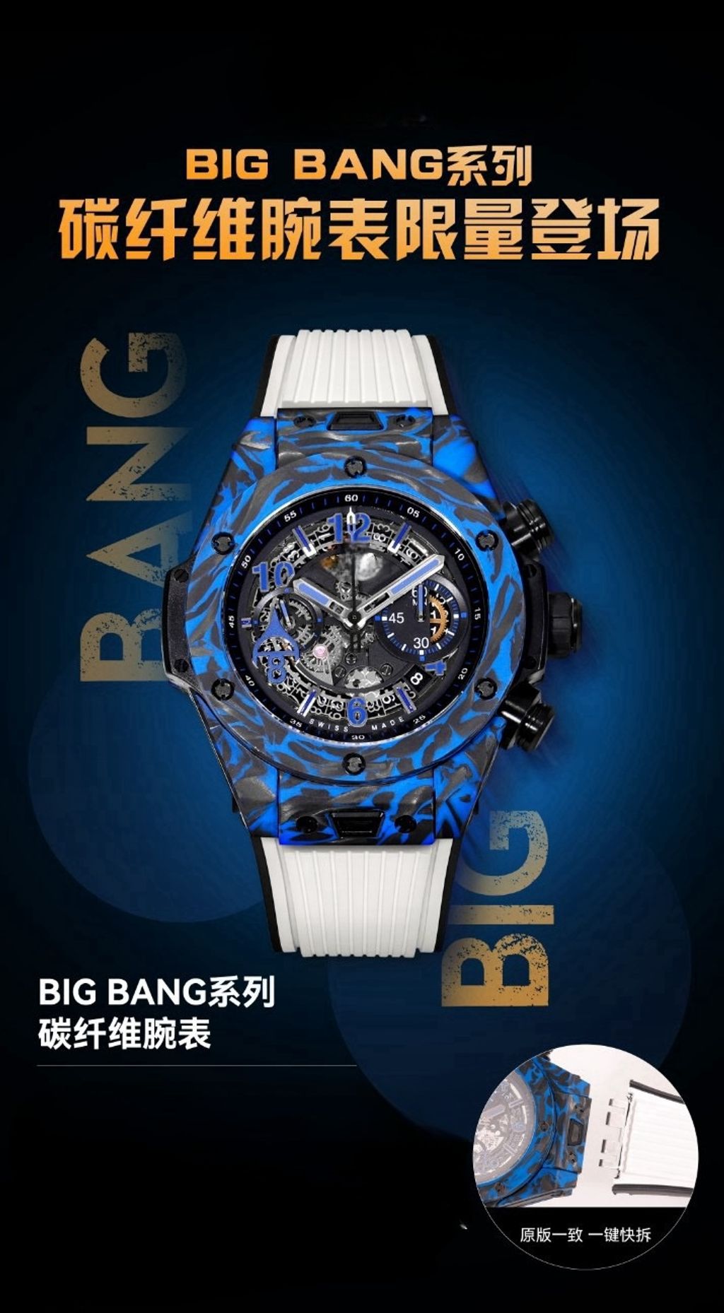 Top luxury replica HB factory HUBLOT BIGBANG series limited edition chronograph watch blue carbon fiber case quick release strap