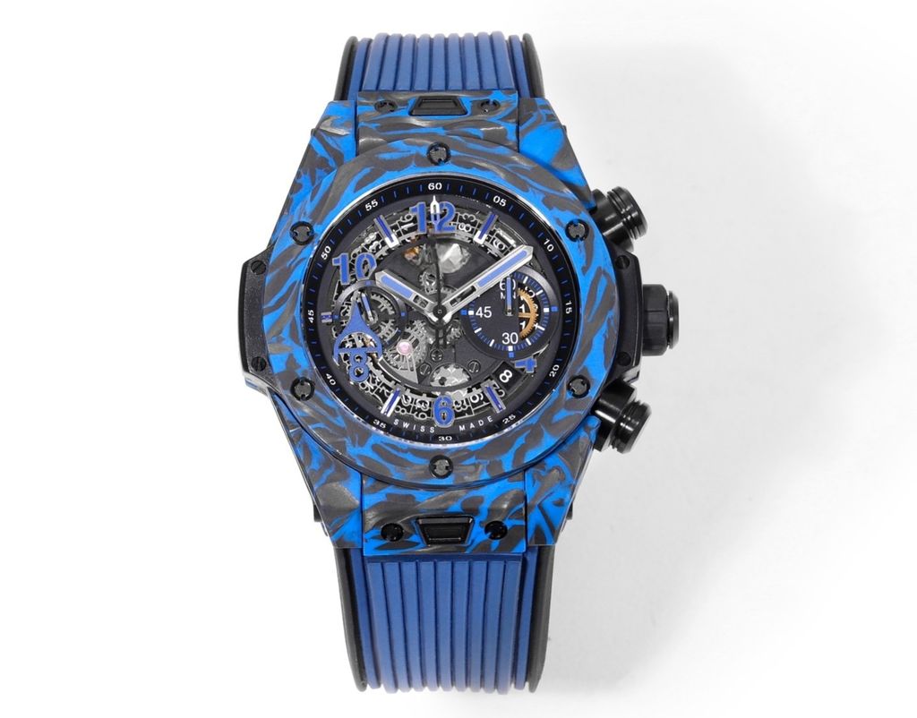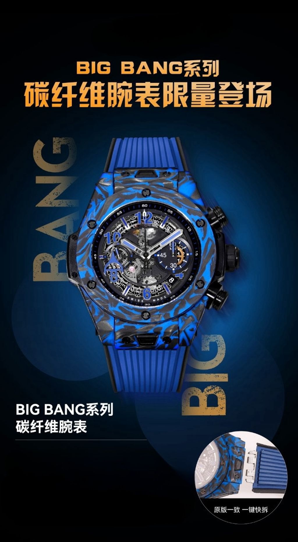 Top luxury replica HB factory HUBLOT BIGBANG series limited edition chronograph watch blue carbon fiber case quick release strap