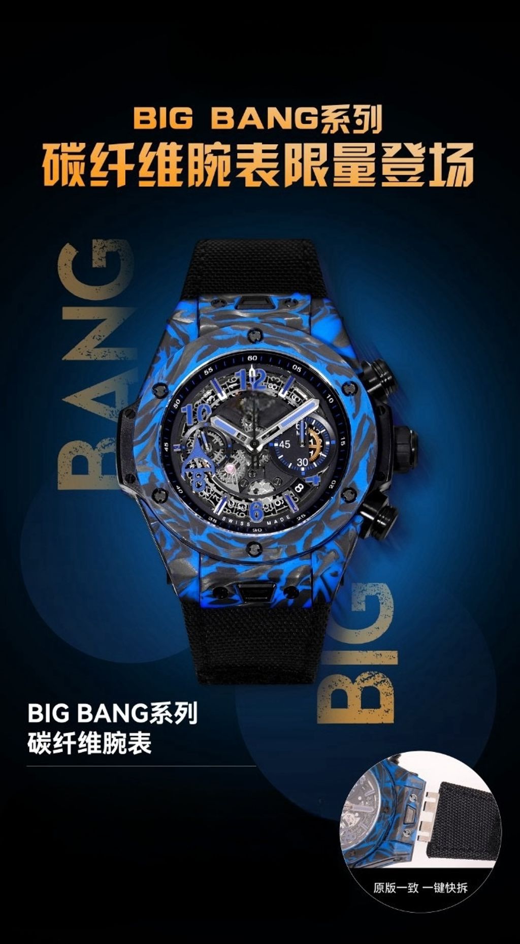 Top luxury replica HB factory HUBLOT BIGBANG series limited edition chronograph watch blue carbon fiber case quick release strap