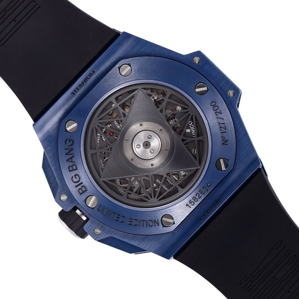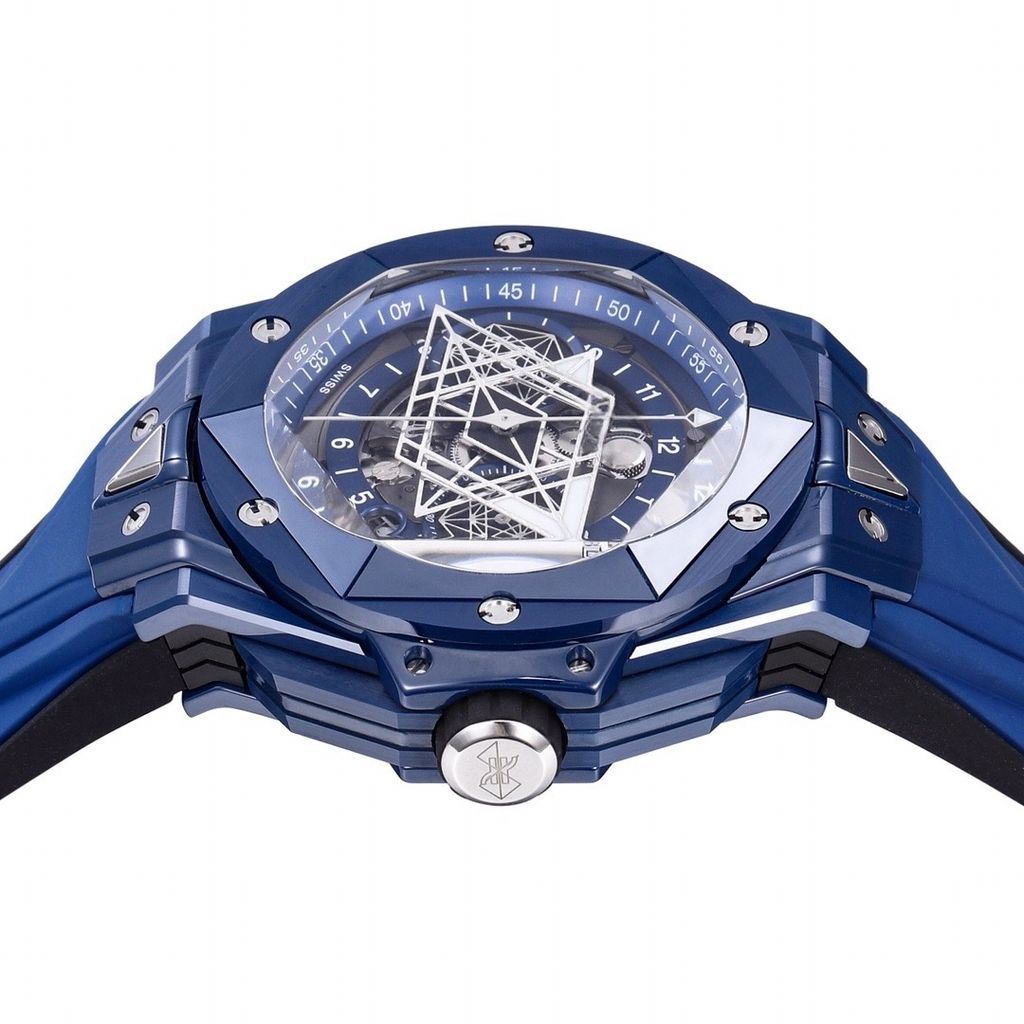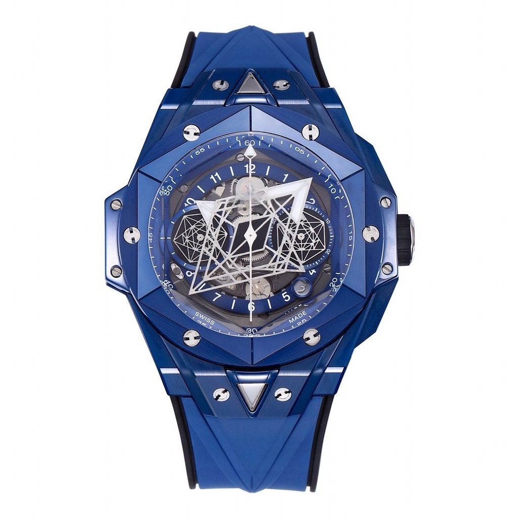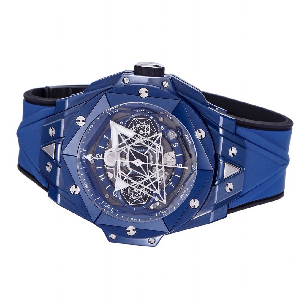 BBF Factory 45mm Top Replica Hublot Sang Bleu II Blue All-Ceramic Case Geometric Cut Hexagonal Dial Chronograph Watch Rubber Strap