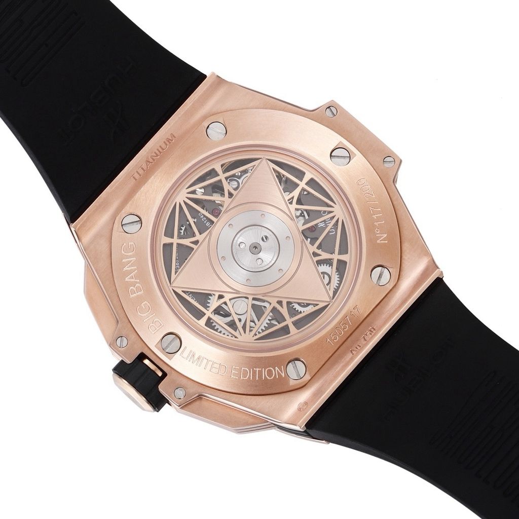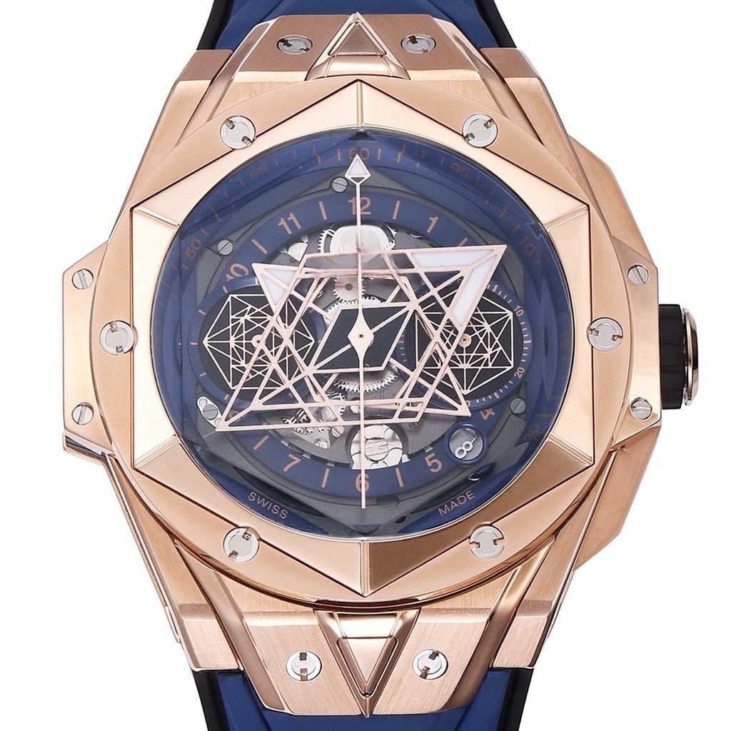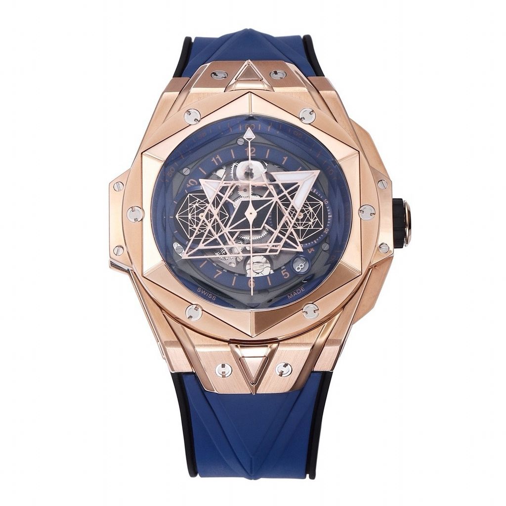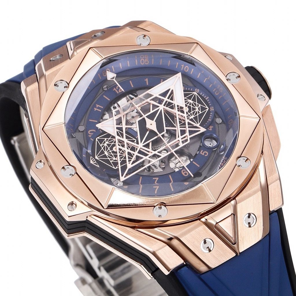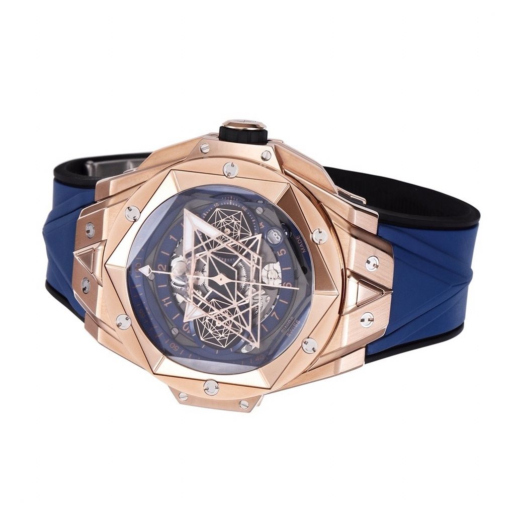45 MM BBF Factory  Top Replica Hublot Sang Bleu II Geometric Cut Hexagonal Dial Chronograph Watch 18K Rose Gold Rubber Strap