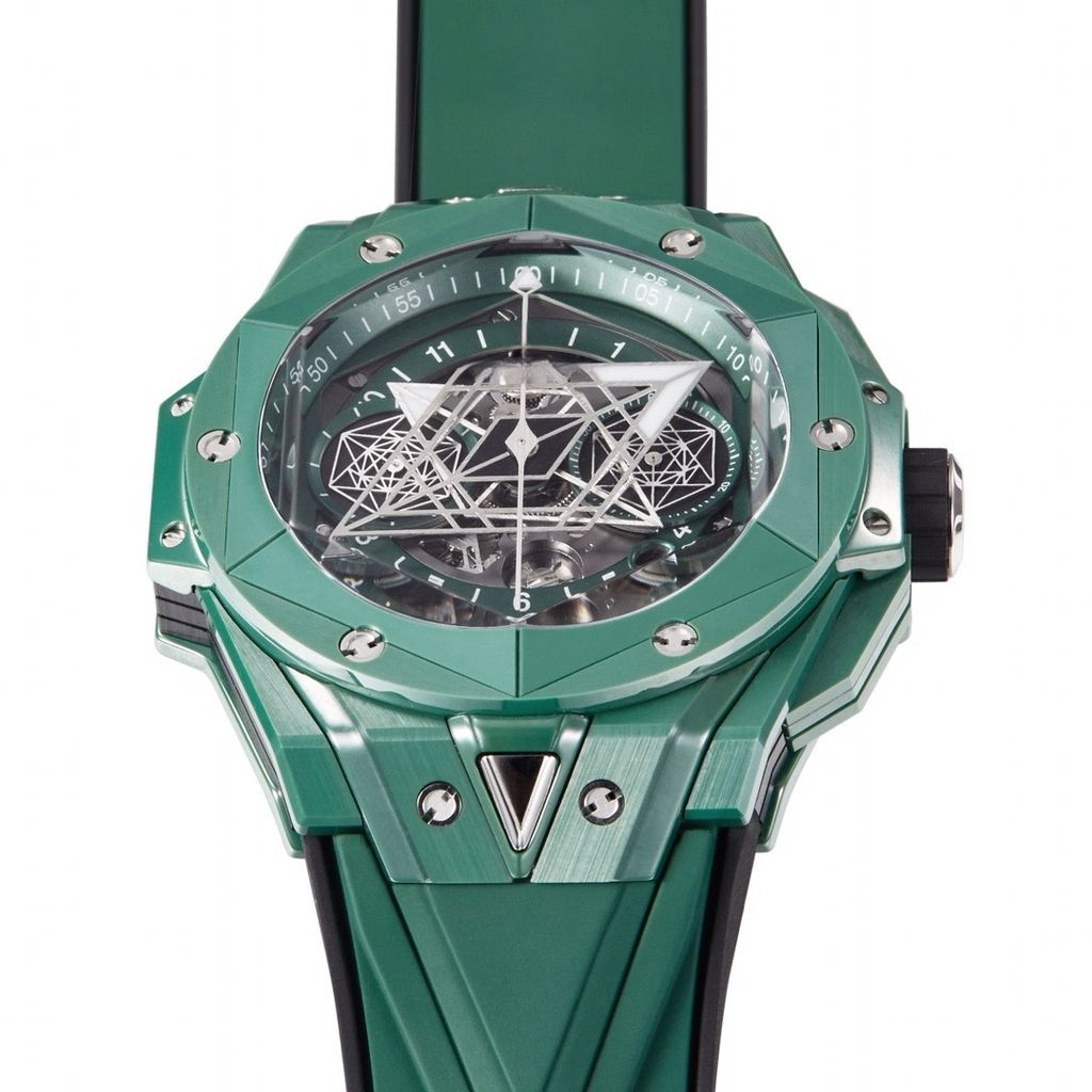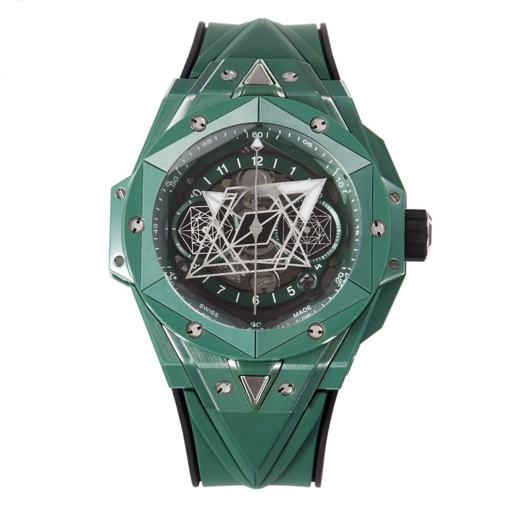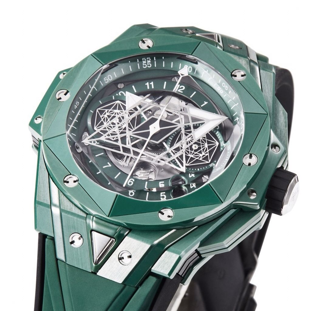 BBF Factory 45mm Top Replica Hublot Sang Bleu II Green All-Ceramic Case Geometric Cut Hexagonal Dial Chronograph Watch Rubber Strap