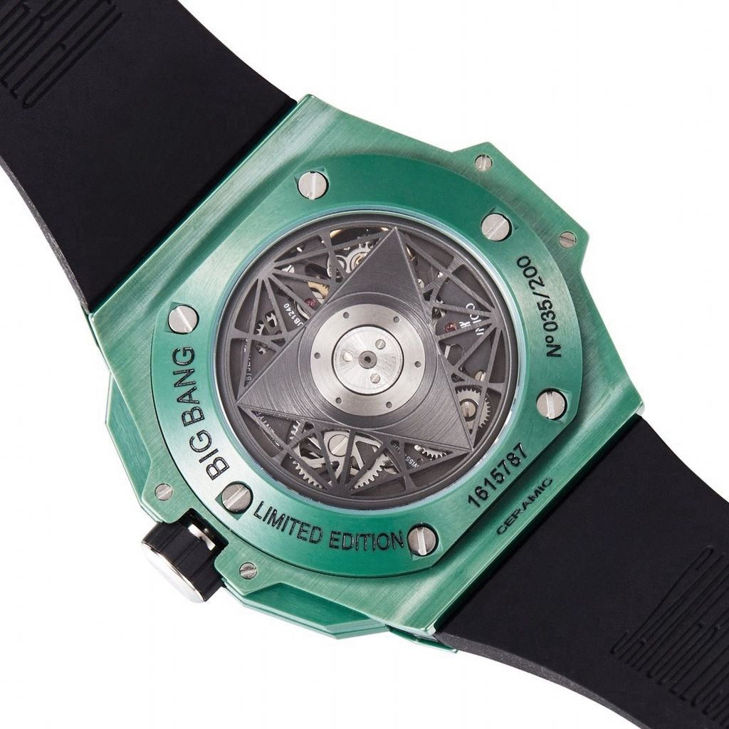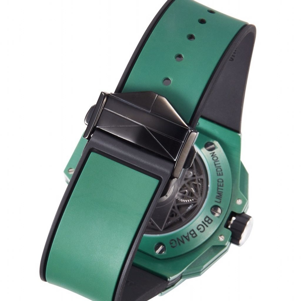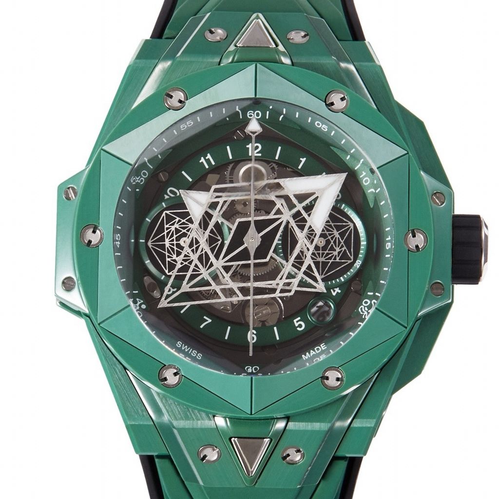 BBF Factory 45mm Top Replica Hublot Sang Bleu II Green All-Ceramic Case Geometric Cut Hexagonal Dial Chronograph Watch Rubber Strap
