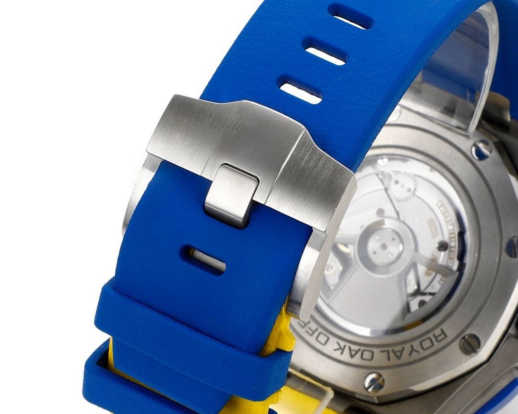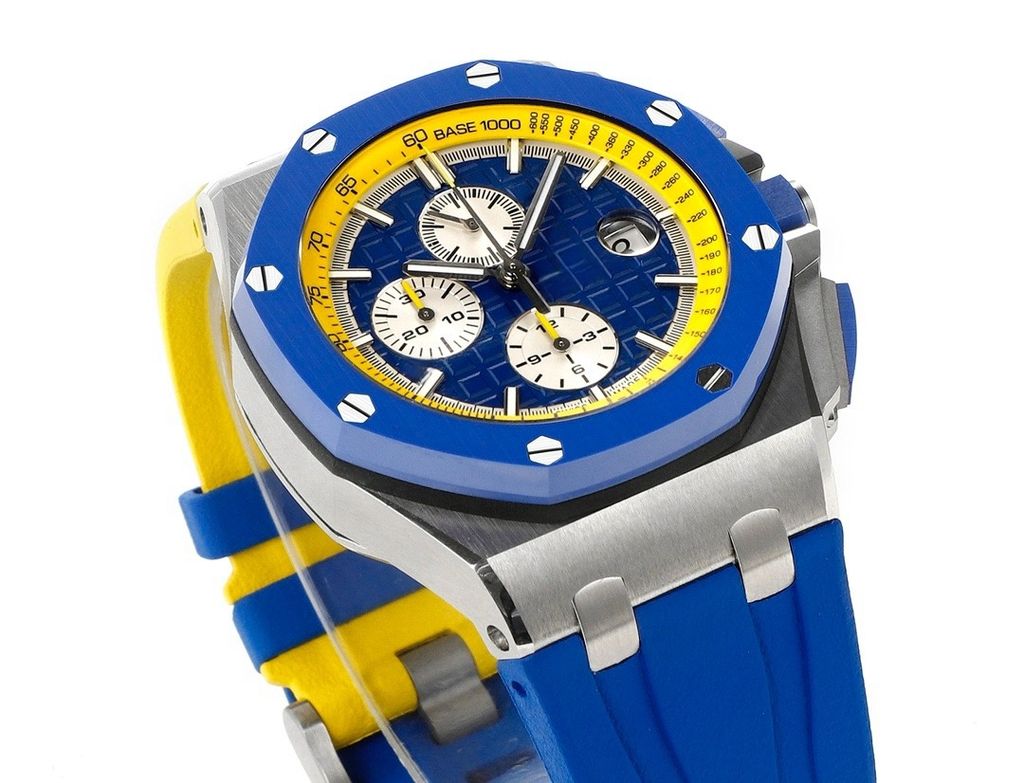 Luxury replica sports Audemars Piguet Royal Oak Offshore 26400SO blue and yellow MegaTapisserie Dial 44mm chronograph rubber strap