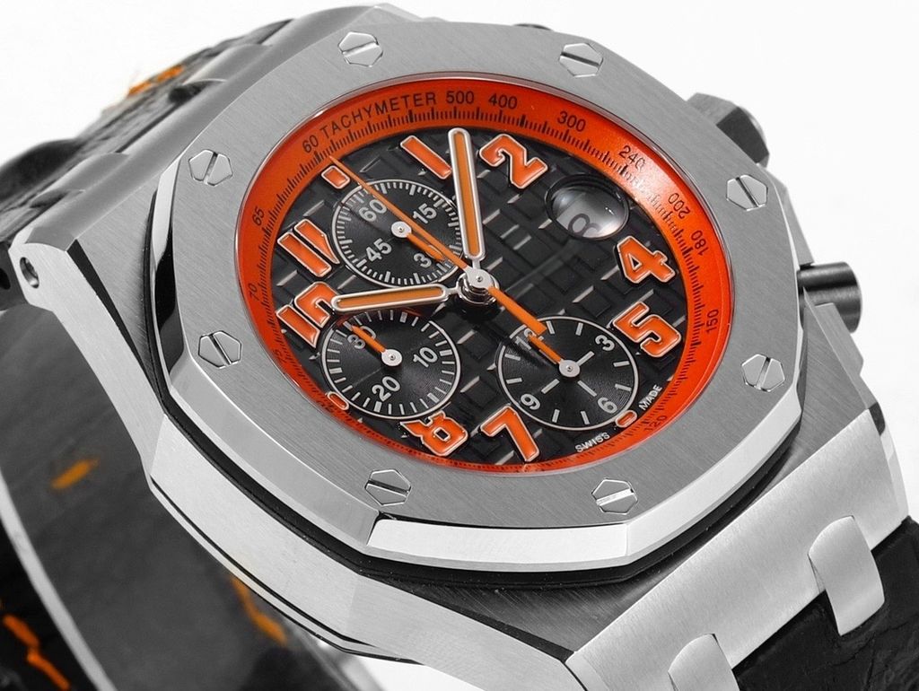 Luxury fashion replica sports Audemars Piguet Royal Oak Offshore 26170ST Black MegaTapisserie Dial 42mm Orange Arabic numerals Red and black chronograph rubber strap