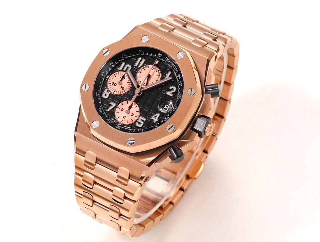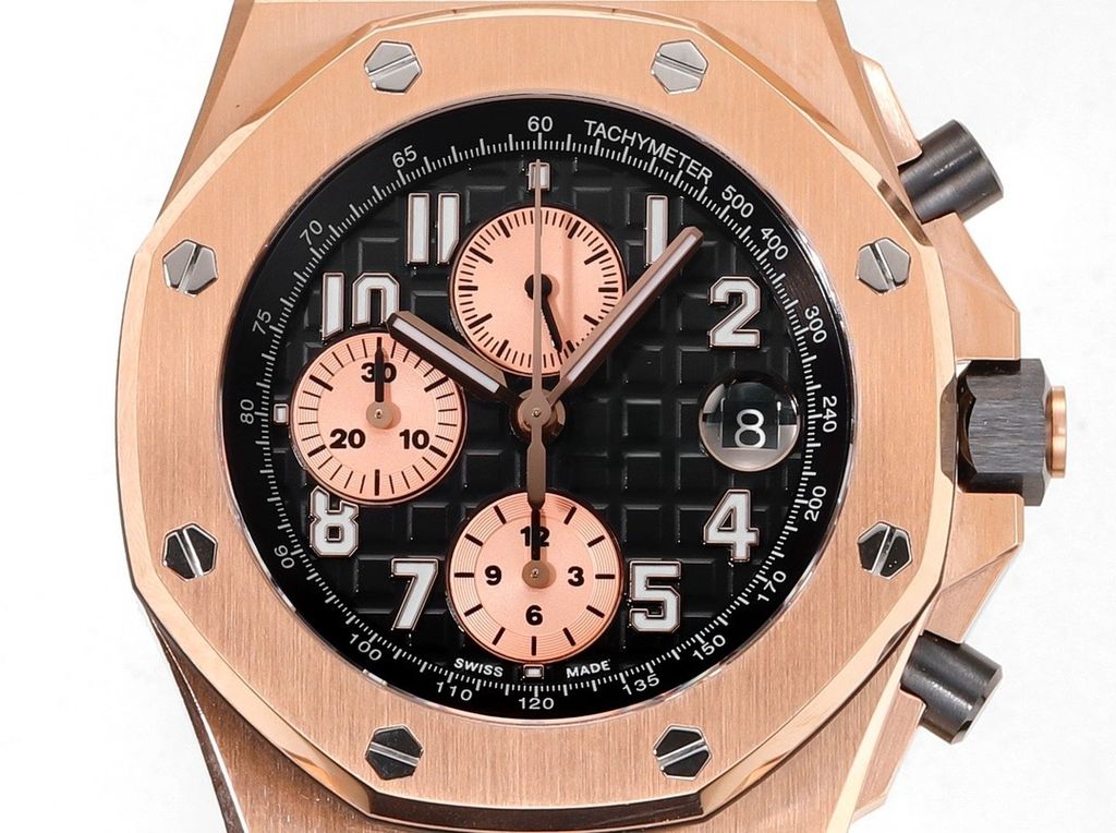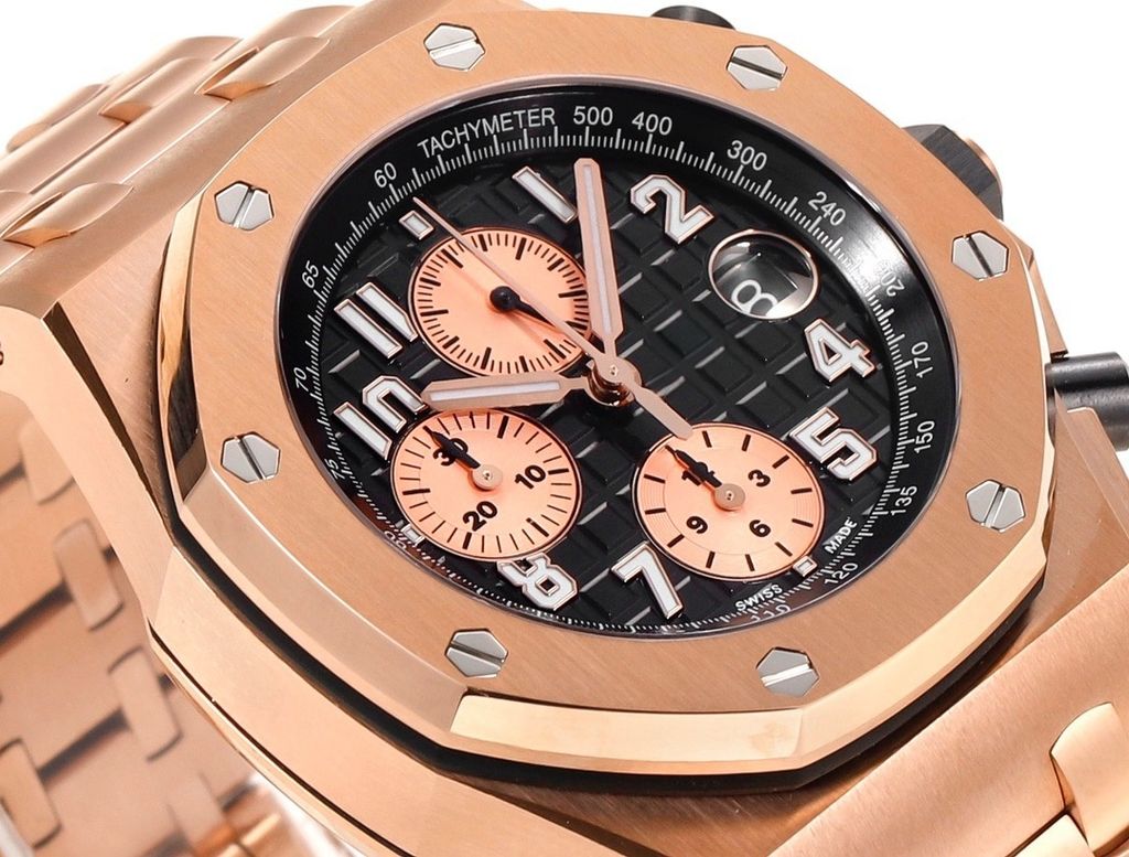 Top replica luxury business Audemars Piguet Royal Oak Offshore 26470OR Black MegaTapisserie Dial 42mm Chronograph 18k rose gold 316 stainless steel strap