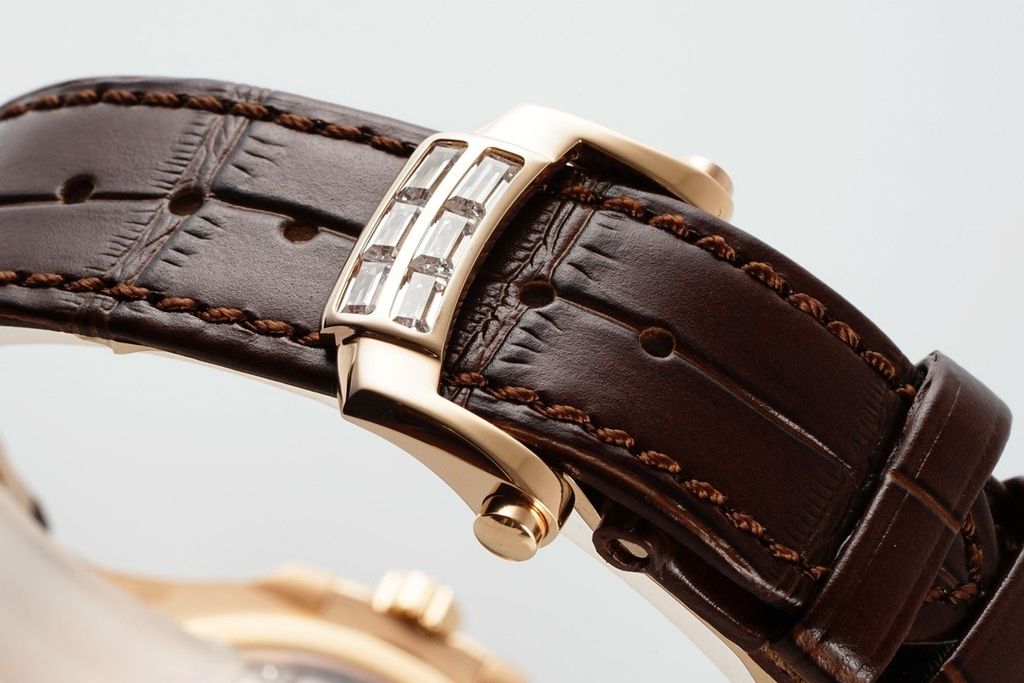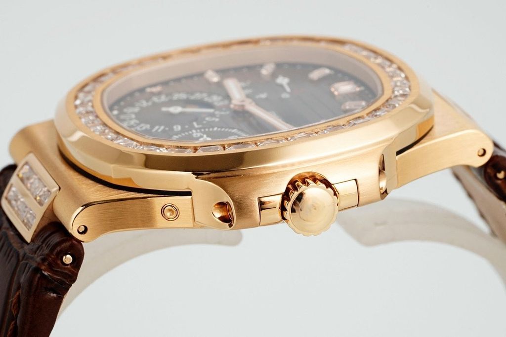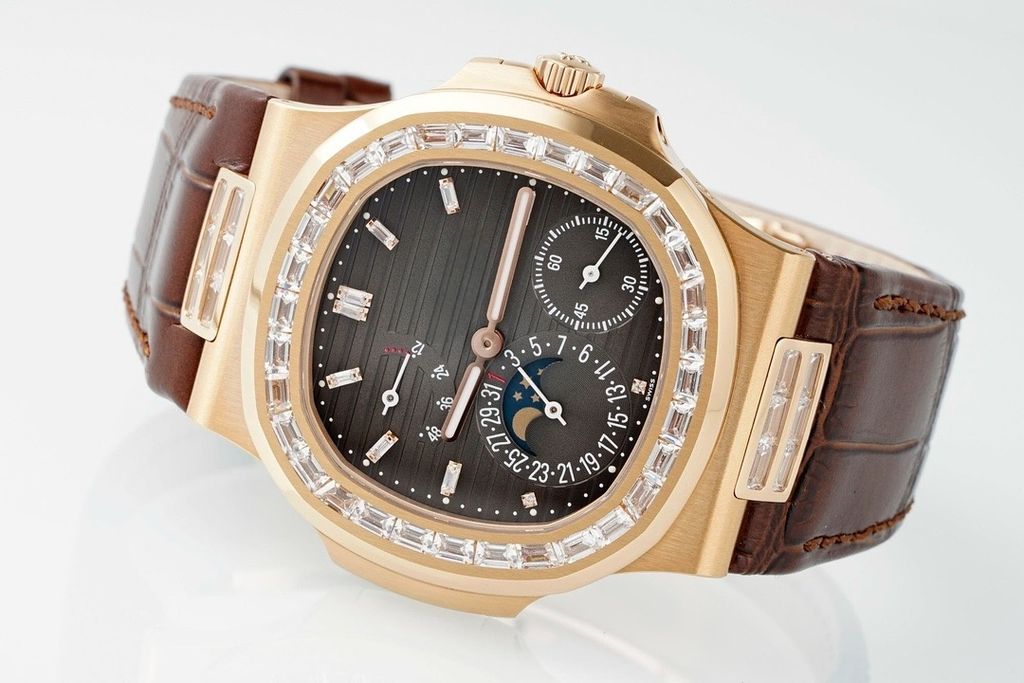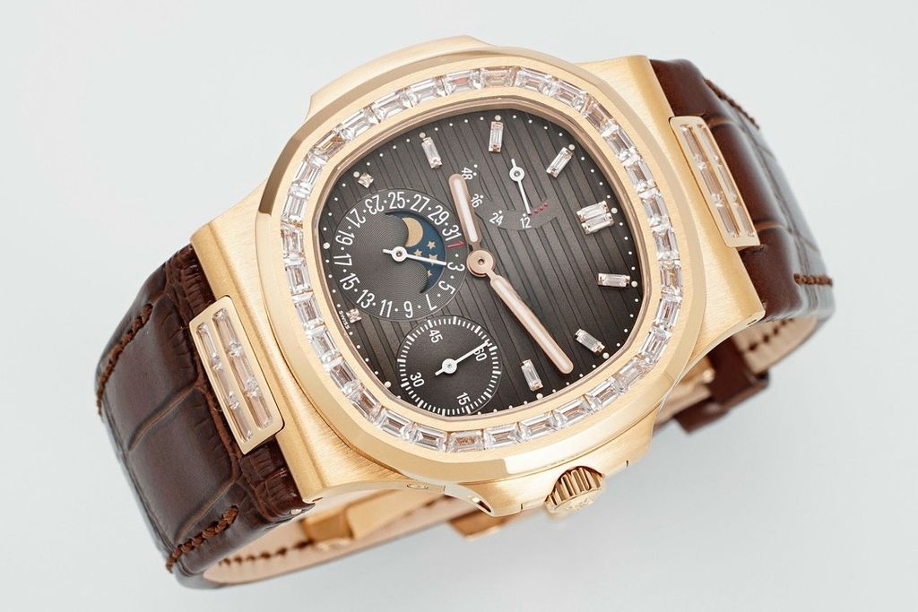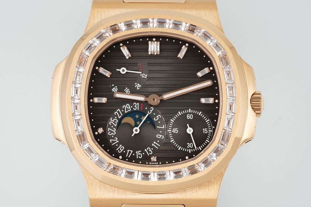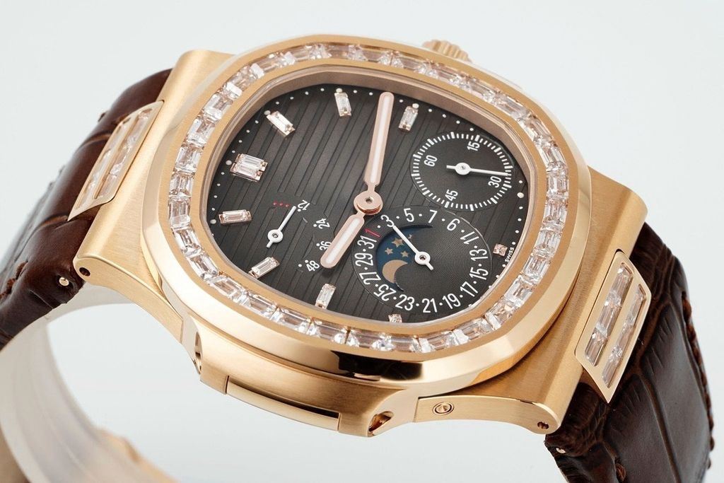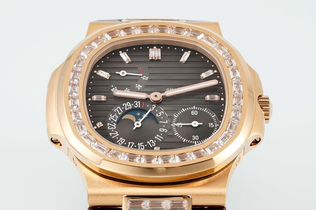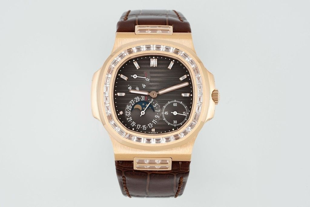 40mm PPF Luxury Replica Patek Philippe Sport Elegance 5712 Moon Phase True Kinetic Display Coffee Dial Square Diamond Genuine Leather StrapBrand:Patek Philippe