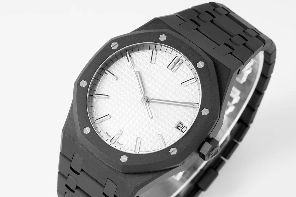 Top replica watch AP Royal Oak 15500ST ZF factory DLC version white Tapisserie checkered dial 41mm diamond carbon black steel case