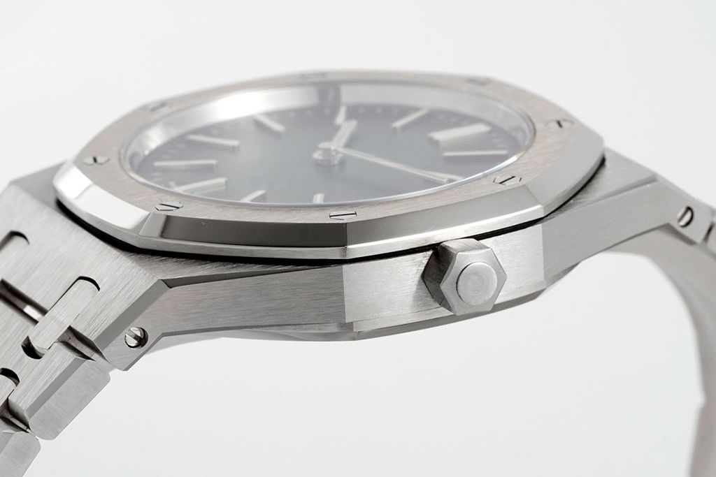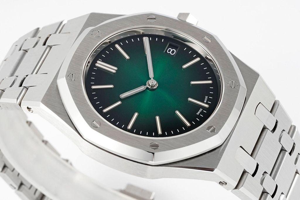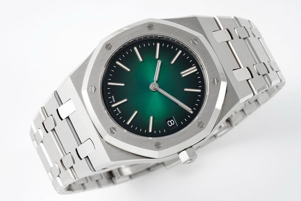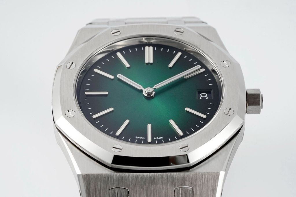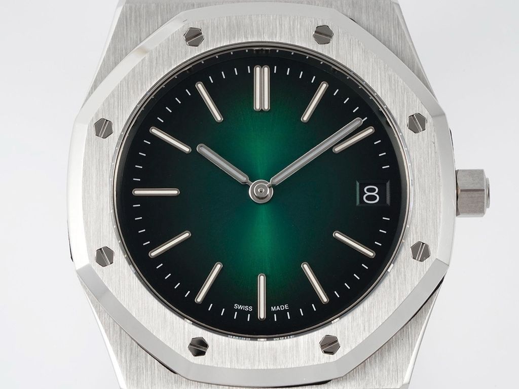 Luxury replica of Audemars Piguet Royal Oak Jumbo Ultra-Thin 16202ST watch 39MM diameter, smoked green sunburst Tapisserie dial