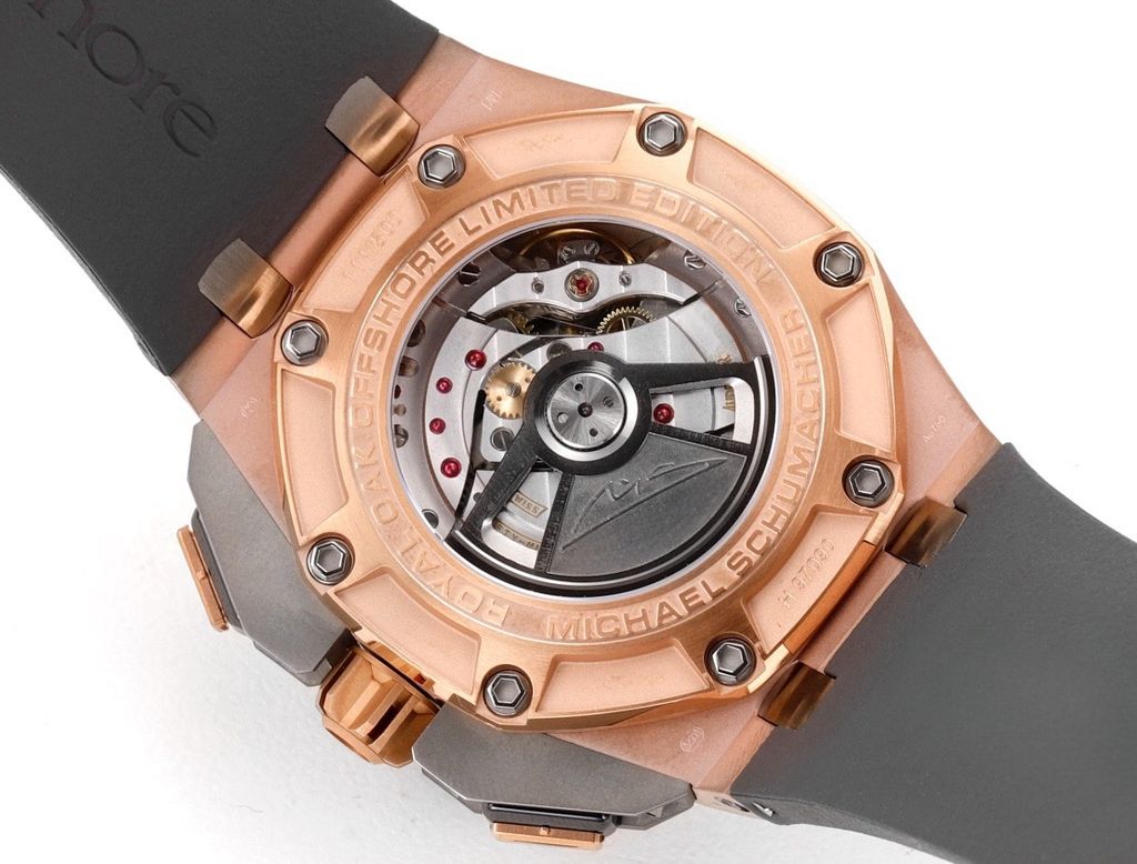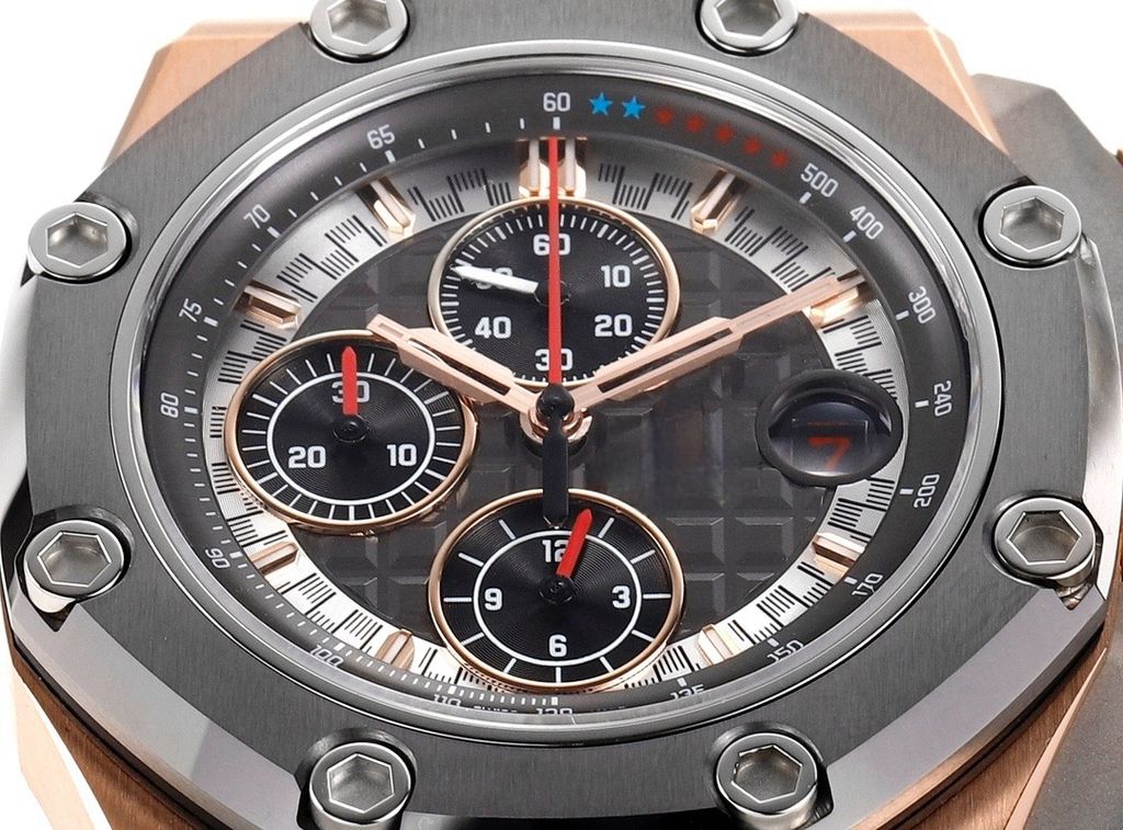 Top replica racing car Audemars Piguet Royal Oak Offshore 26568OM dark grey Mega Tapisserie dial chronograph 44mm 18k rose gold rubber strap