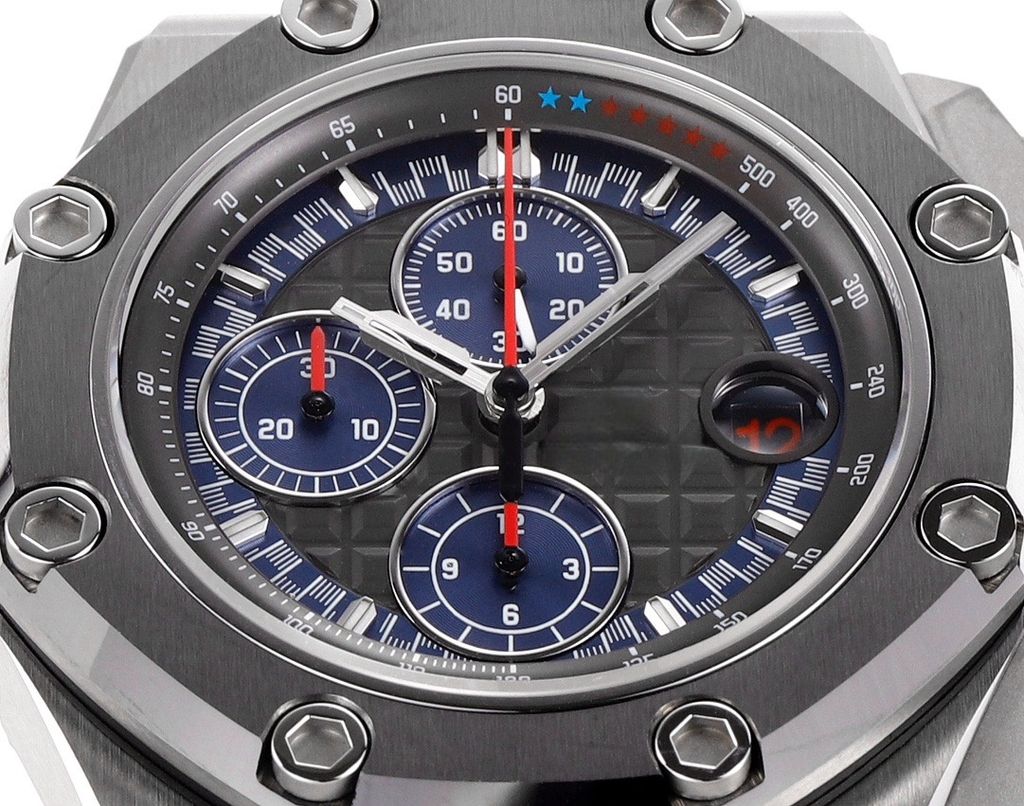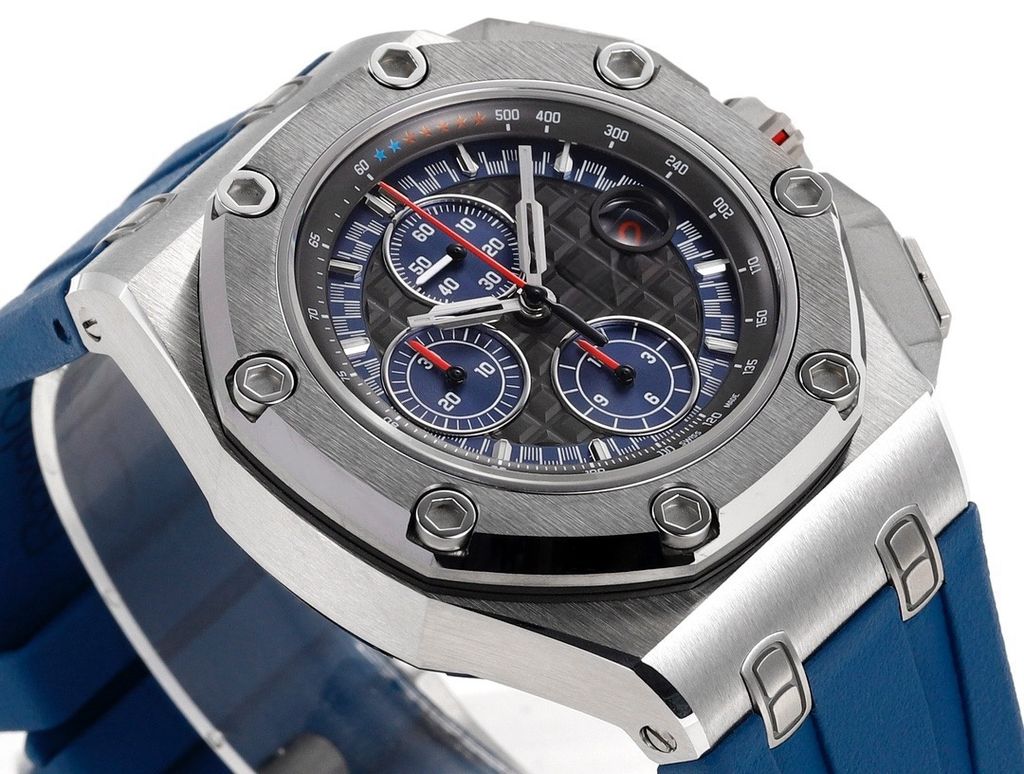Luxury replica sports Audemars Piguet Royal Oak Offshore 26568PM dark gray blue Mega Tapisserie dial chronograph 44mm JF factory rubber strap